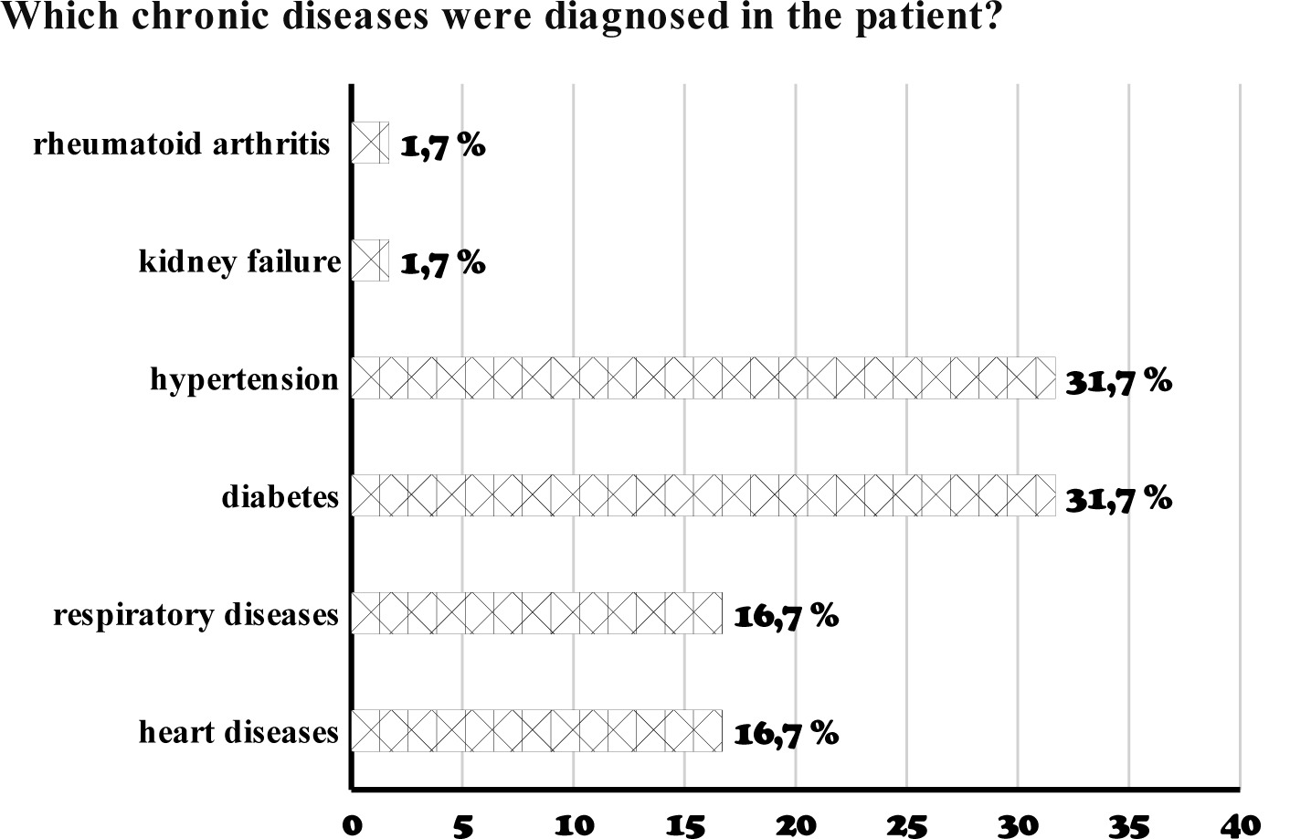 The most common chronic diseases among the studies patients were the hypertension (31,7% of patients) and diabetes (31,7% of patients). Other diagnosed conditions included respiratory diseases (16,7% of patients), heart diseases (16,7% of patients) and kidney failure (1,7% of patients), while rheumatoid arthritis (RA) was present among 1,7% of patients.