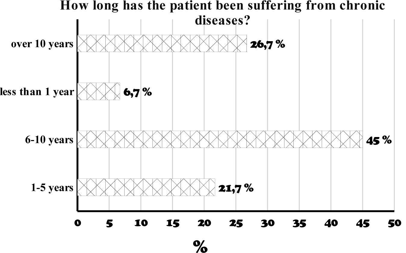 The largest group of patients has been suffering from chronic diseases for 6-10 years (45%), while 26,7% of patients have had their conditions for over 10 years. Between 1 and 5 years, 21,7% of patients have been affected, and the smallest group consists of those who have been ill for last than 1 year (6,7%).