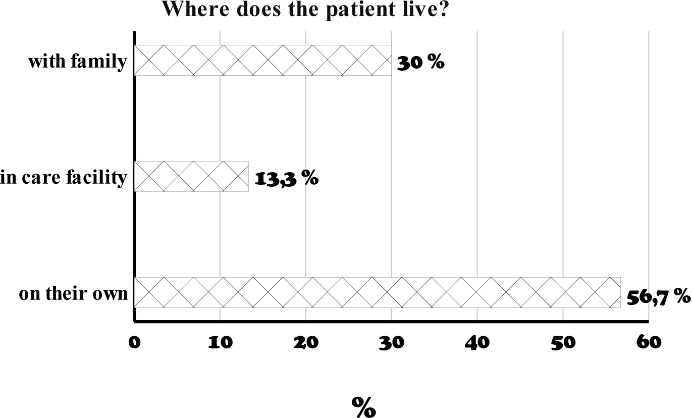 Over a half of the responders live independently (56,7%), 30% live with family and 13,3% reside in care facilities.
