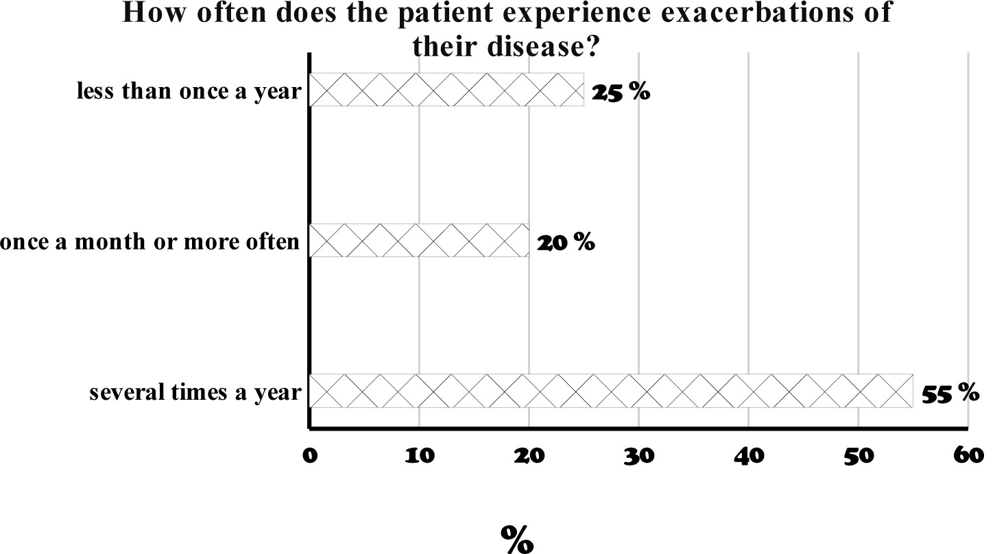 Exacerbations of chronic diseases occur several times a year in more than half of the patients (55%), while less that once a year in 25% of patients. In 20% of patients, exacerbations occur once a month or more frequently.