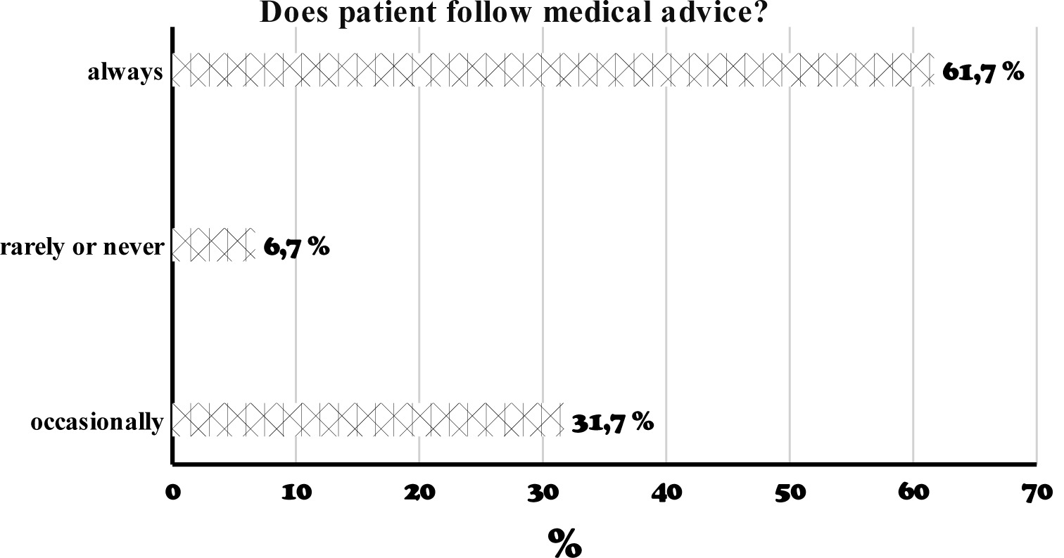 The majority of patients always follow medical recommendations (61,7%), while 31,7% adhere only occasionally. The group of patients who rarely or never follow medical advice constitutes 6,7% of patients.