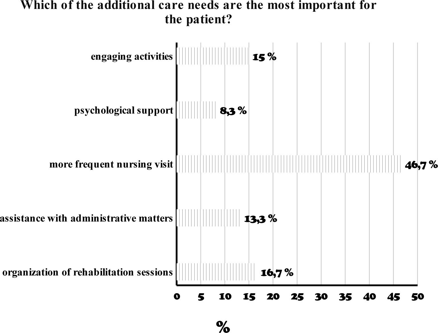 More frequent nursing visits were clearly the most desired by respondents (46.7%). The next most important needs were increased rehabilitation sessions for patients (16.7%) and, similarly, engaging activities (15%). The least reported needs were assistance with administrative matters (13.3%) and psychological support (8.3%).
