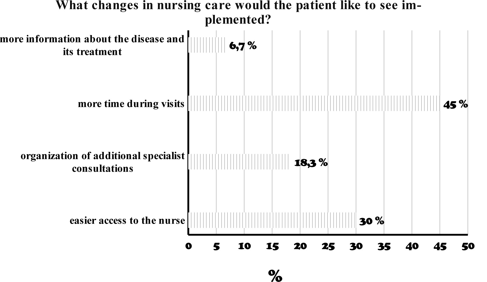 The majority of patients would definitely like nursing staff to spend more time with them during visits (45%) and to have easier access to the staff (30%). According to the patients, organizing additional specialist consultations (18,3%) or providing more information about their disease (6,7%) is less necessary.