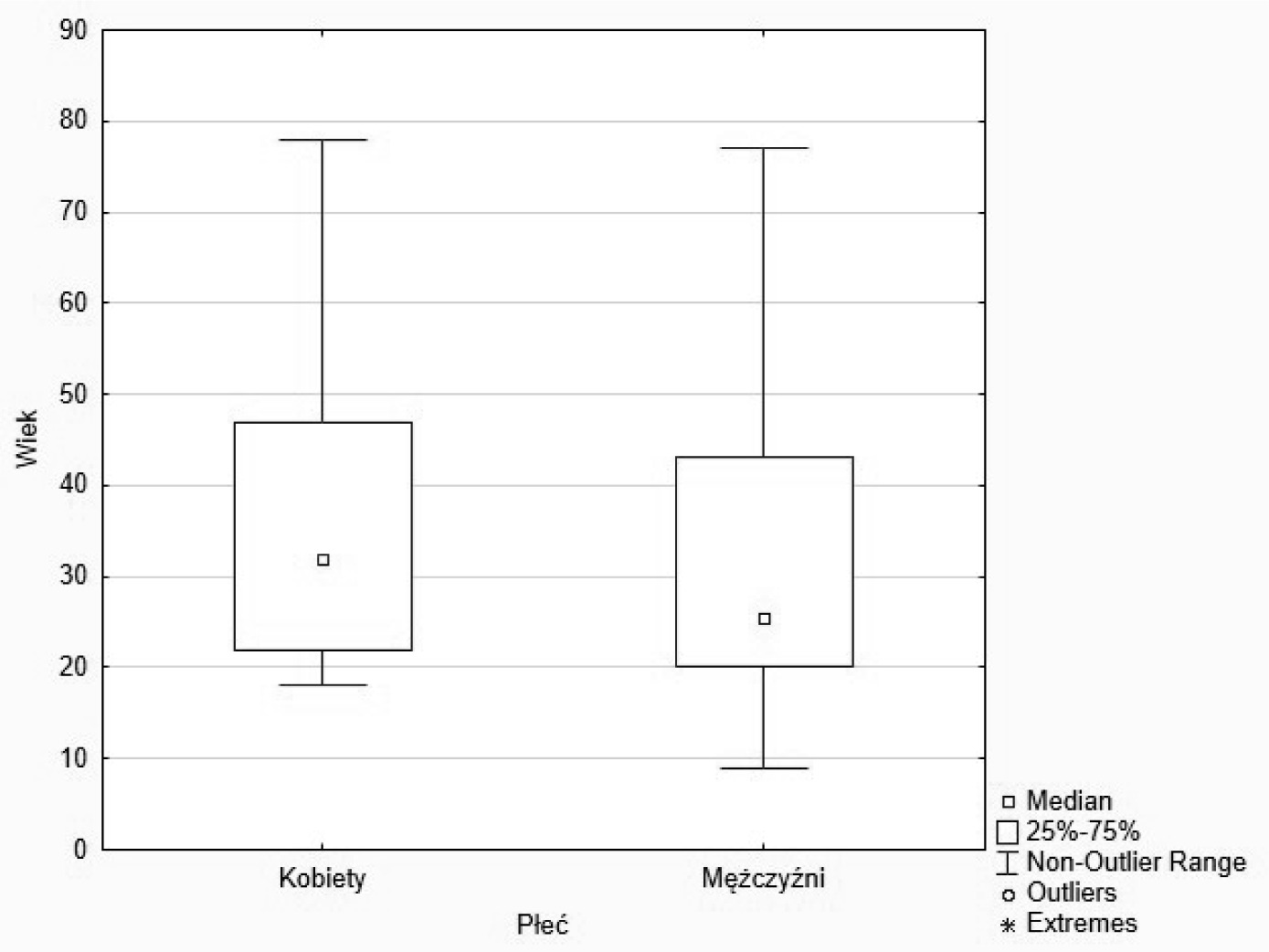 322 people took part in the anonymous survey. The respondents included 86% women (N-276) and 14% men (N-46). 50% (N-161) of respondents came from rural areas, urban <50 thousand people. Residents – 11% (N-37), city 50-200 thousand. Residents – 27% (N-88), a city 200-500 thousand. Residents – 6% (N-18), city > 500 thousand. Residents – 6% (N-18). The largest group of respondents were people declaring their marital status as married 43% (N-140), then maiden/bachelor 30% (N-96), having a partner 17% (N-55), widow/widower 5% (N-15), divorced 4% (N-14), separated 1% (N-2). In terms of education, 52% (N-167) of people with secondary education participated in our study. 41% (N-132) of respondents obtained higher education, while 5% (N-17) had basic vocational or vocational education, and 2% (N-6) had primary education. The minimum age of the respondents was 18 years and the maximum age was 78 years. The minimum age for women was 18 years and the maximum age was 78 years. The minimum age for men was 19 years and the maximum age was 77 years. [Table 1, Figure 1]