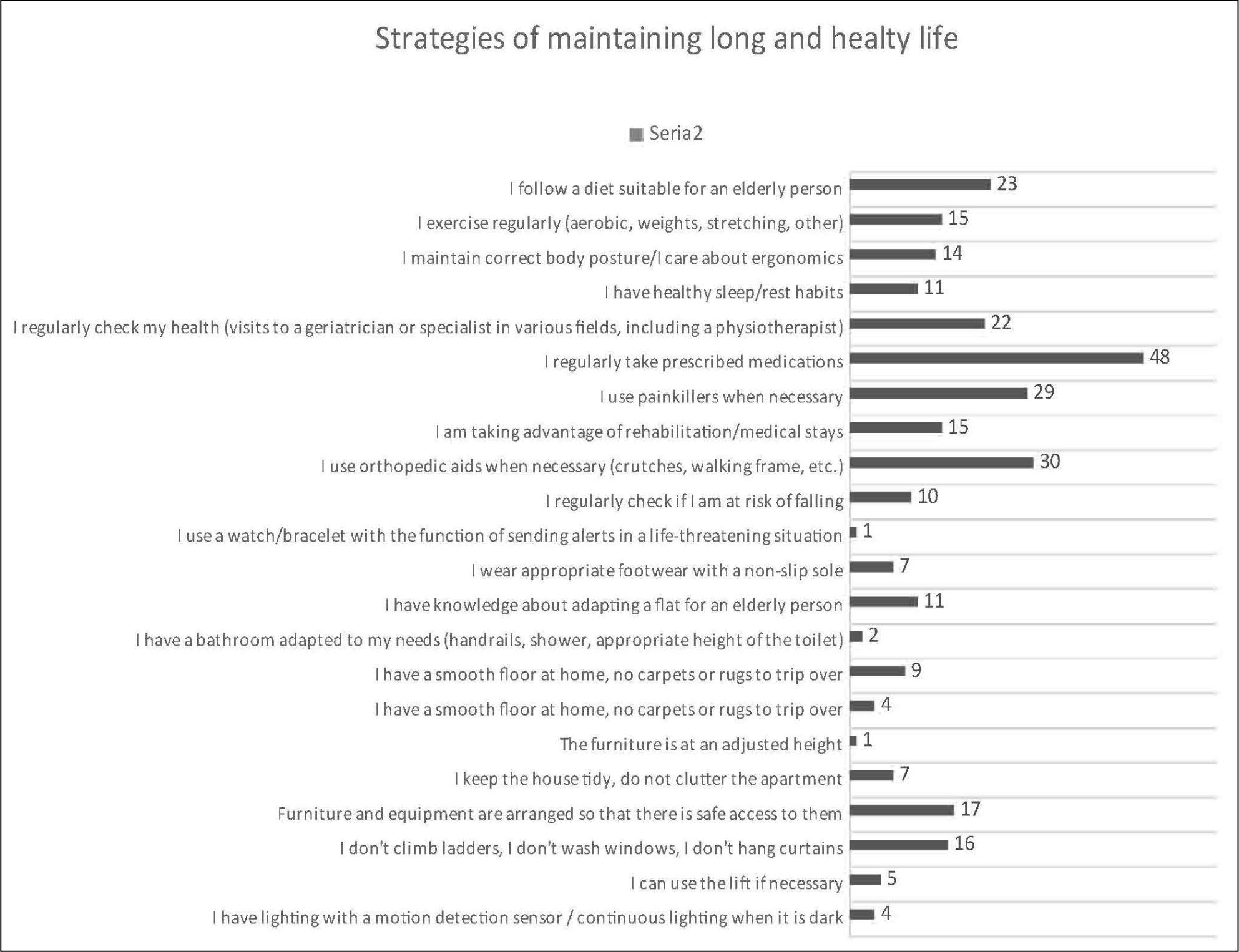 The study draws attention to the fact that a small percentage of respondents take specific actions to maintain a long and healthy life. Only about 15% of the surveyed people have knowledge about the possibility of adapting the apartment in terms of the changing needs of the elderly, and few people take preventive measures, both pro-health habits and specific actions aimed at reducing accidental falls.