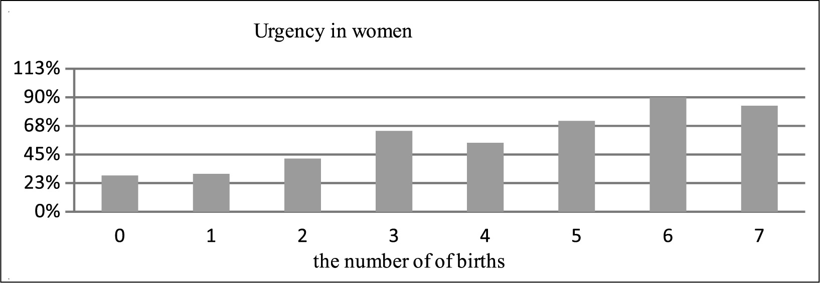A similar relationship is found in the appearance of uncontrolled urinary leakage, these are patients with all types of UI. In women who gave birth at least twice, more than 20% showed urinary urgency. 30% of women after four deliveries and 70% after six deliveries admitted to having this problem (Fig. 2).