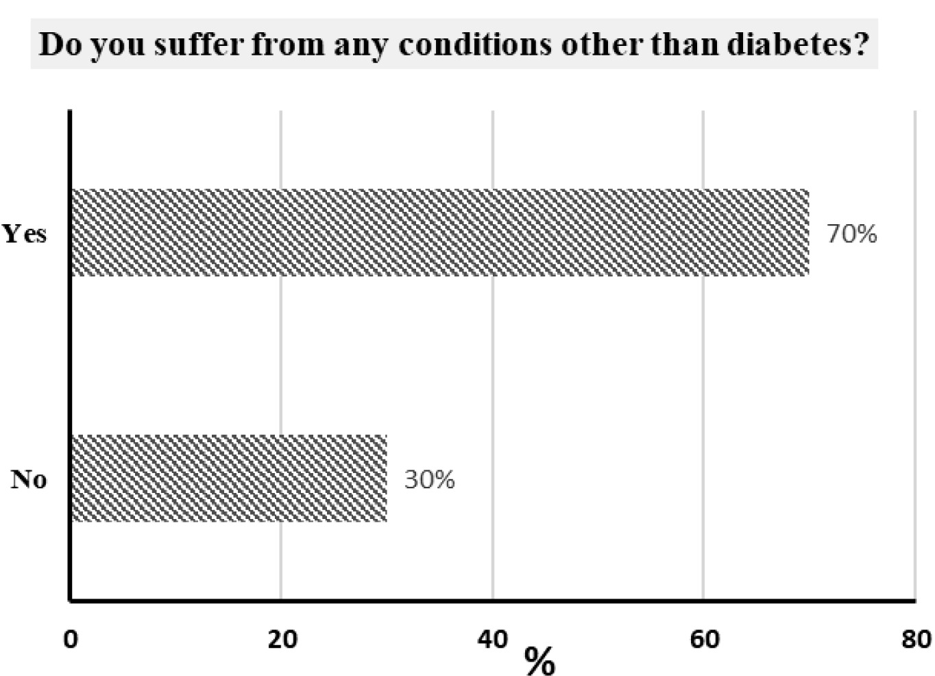 Figure 2 shows the distribution of responses to question no. 1 “Do you suffer from any conditions other than diabetes?” Thirty-five respondents (70%) reported different conditions in addition to diabetes, while 15 participants (30%) indicated no coexisting conditions.