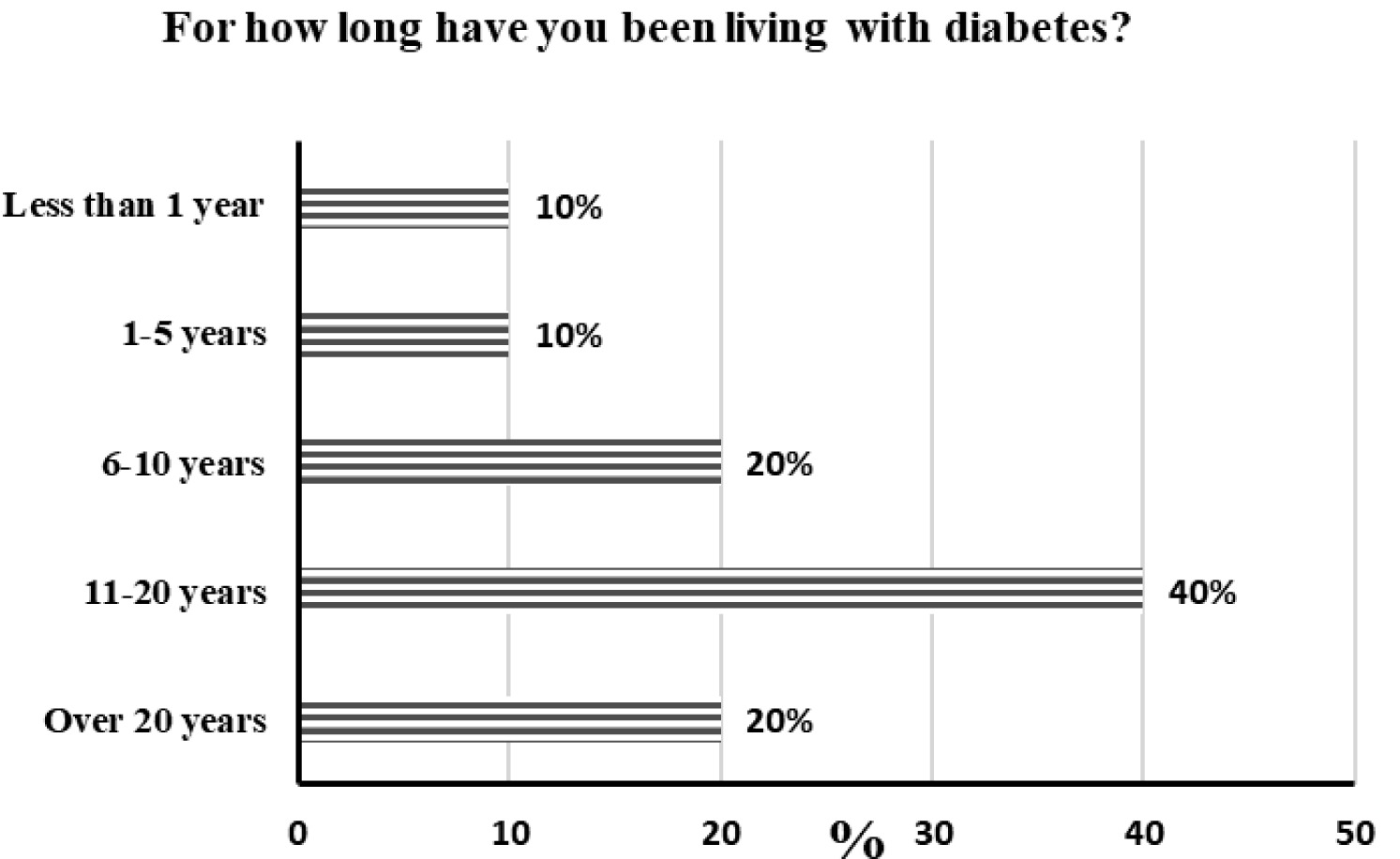 Figure 3 shows the distribution of responses to question no. 2 “For how long have you been living with diabetes?” Twenty participants (40%) had been living with diabetes for 11–15 years, 10 participants (20%) for 6–10 years, another 10 participants (20%) for more than 20 years, 5 participants (10%) for 1–5 years, and 5 participants (10%) for less than 1 year.