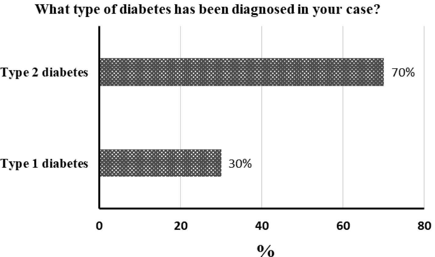 Figure 4 shows the distribution of responses to question no. 3 “What type of diabetes has been diagnosed in your case?” Thirty-five respondents (70%) reported type 2 diabetes, while 15 participants (30%) indicated type 1 diabetes.