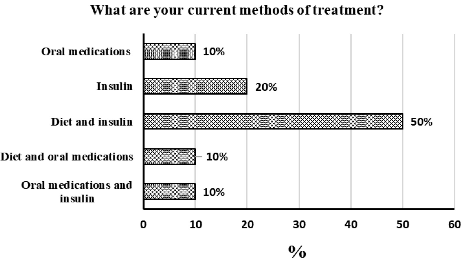 Figure 5 shows the distribution of responses to question no. 4 “What are your current methods of treatment?” Twenty-five respondents (50%) reported combining dietary management with insulin therapy. Other responses included: 10 participants (20%) treated solely with insulin, 5 participants (10%) with oral hypoglycaemic agents, 5 participants (10%) with diet and oral medication, and 5 participants (10%) with a combination of oral medication and insulin.