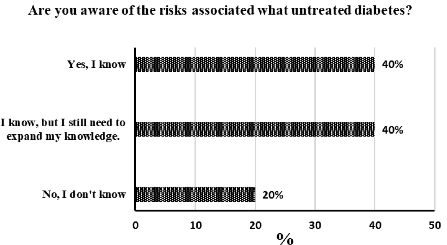 Figure 6 shows the distribution of responses to question no. 5 “Are you aware of the risks associated with untreated diabetes?” Twenty respondents (40%) reported awareness of the risks of untreated diabetes, 20 participants (40%) declared the need to expand their knowledge in this area, and 10 participants (20%) stated they were unaware of the potential consequences.