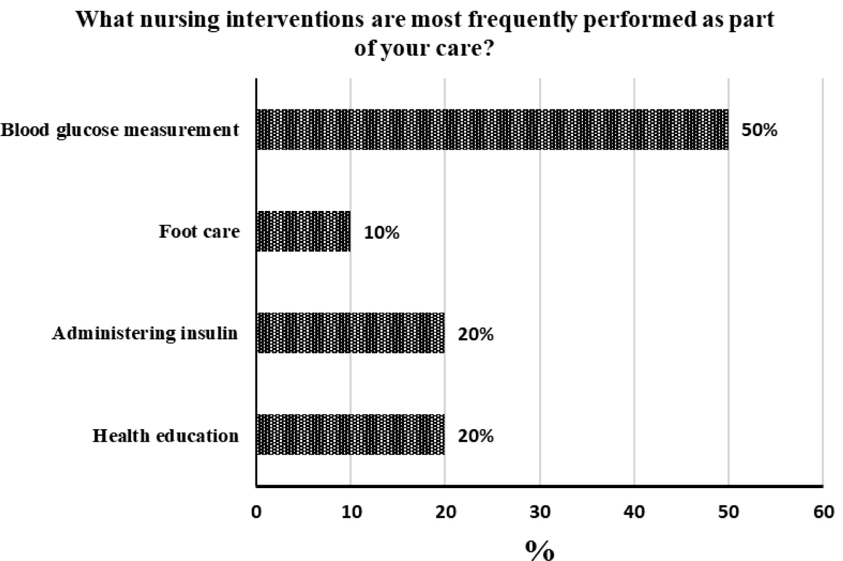 Figure 8 shows the distribution of responses to question no. 7 “What nursing interventions are most frequently performed as part of your care?” Twenty-five respondents (50%) reported that the most common nursing activity was blood glucose monitoring, whereas the least frequent was foot care (5 participants, 10%). Insulin administration and health education were each reported by 10 respondents (20%).