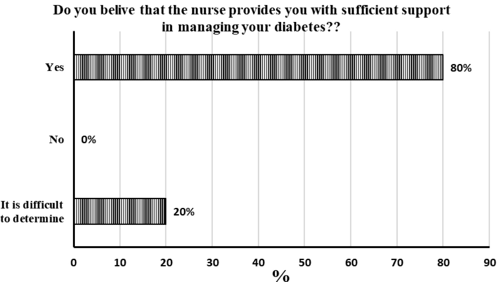 Figure 9 shows the distribution of responses to question no. 8 “Do you believe that the nurse provides you with sufficient support in diabetes care?” Forty respondents (80%) reported adequate support from nurses in diabetes care, while 10 participants (20%) indicated difficulty in assessing the level of support.
