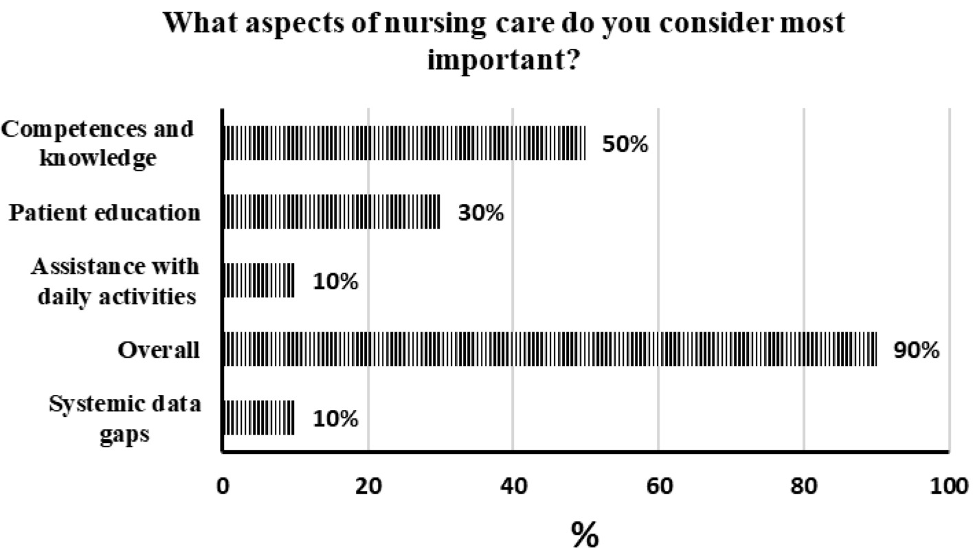 Figure 11 shows the distribution of responses to question no. 10 “Which aspects of nursing care do you consider most important?” The majority of respondents (25 participants, 50%) identified nurses’ competence and knowledge as the most important aspect of nursing care. The least important was assistance with activities of daily living (5 participants, 10%). Other responses included education (15 participants, 30%), while 5 participants (10%) provided no data.