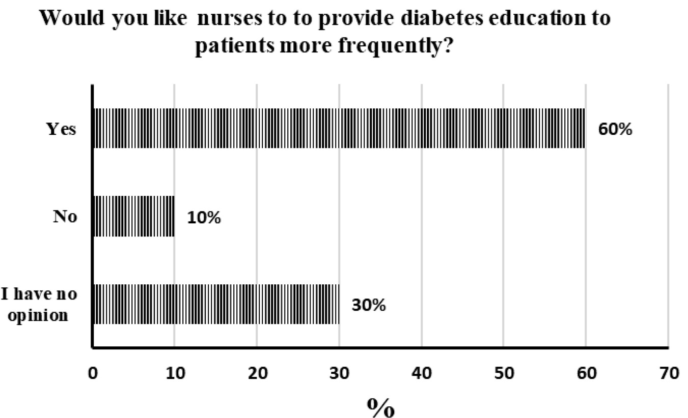 Figure 12 shows the distribution of responses to question no. 11 “Would you like nurses to provide diabetes education to patients more frequently?” Thirty respondents (60%) stated that they would like nurses to educate patients more often. Five respondents (10%) reported that they would not want more frequent education, while 15 participants (30%) had no opinion on the matter.