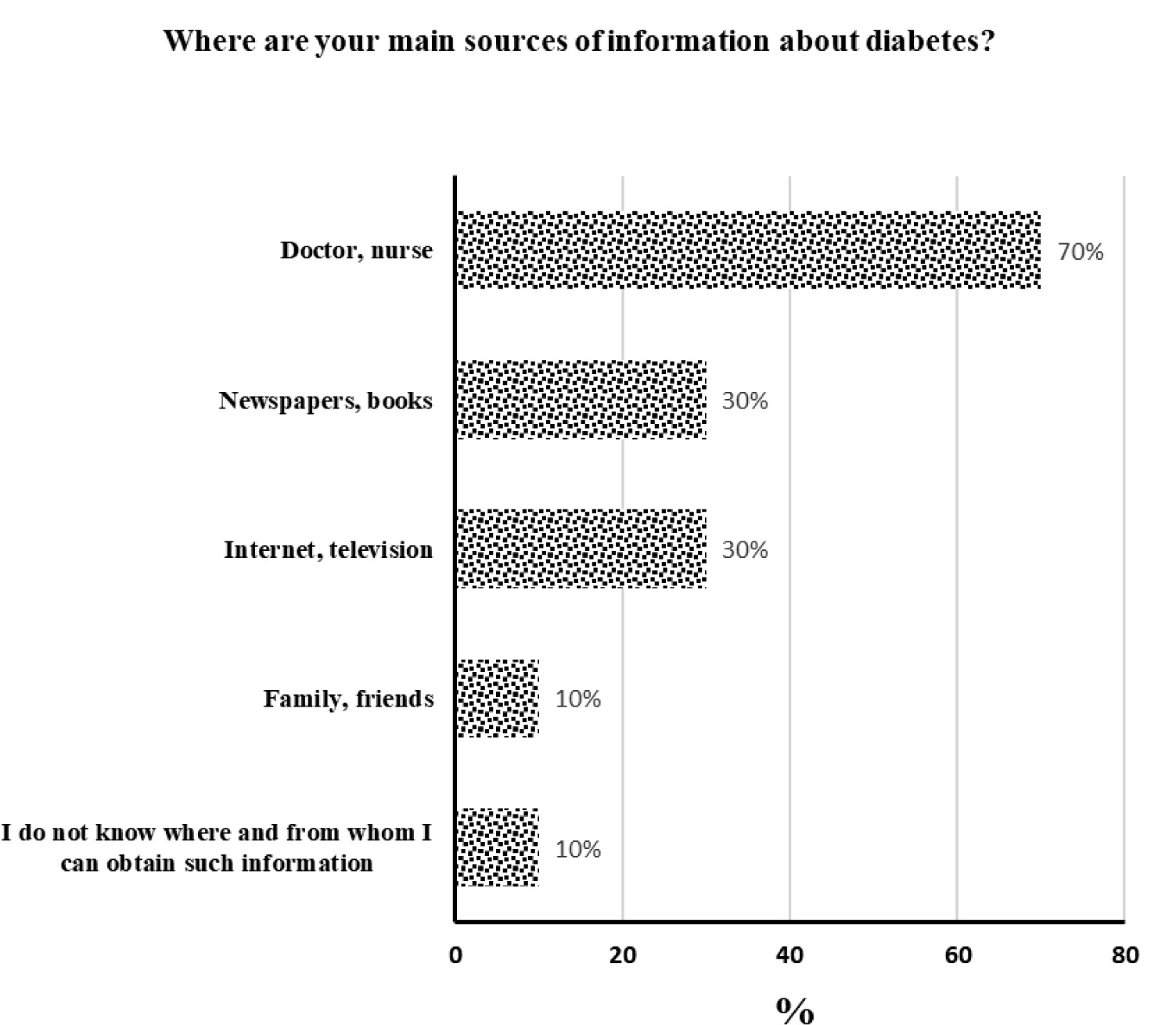 Figure 13 shows the distribution of responses to question no. 12 “What are your main sources of information about diabetes?” The majority of respondents (35 participants, 70%) indicated that they obtained knowledge about the disease from physicians and nurses. Additional sources of information included the press and books (15 participants, 30%), as well as the internet and television (15 participants, 30%). The least common sources were family and friends (5 participants, 10%), and uncertainty regarding where or from whom to obtain information (5 participants, 10%). Note: multiple answers were permitted for this question; therefore, the total percentage exceeds 100%.