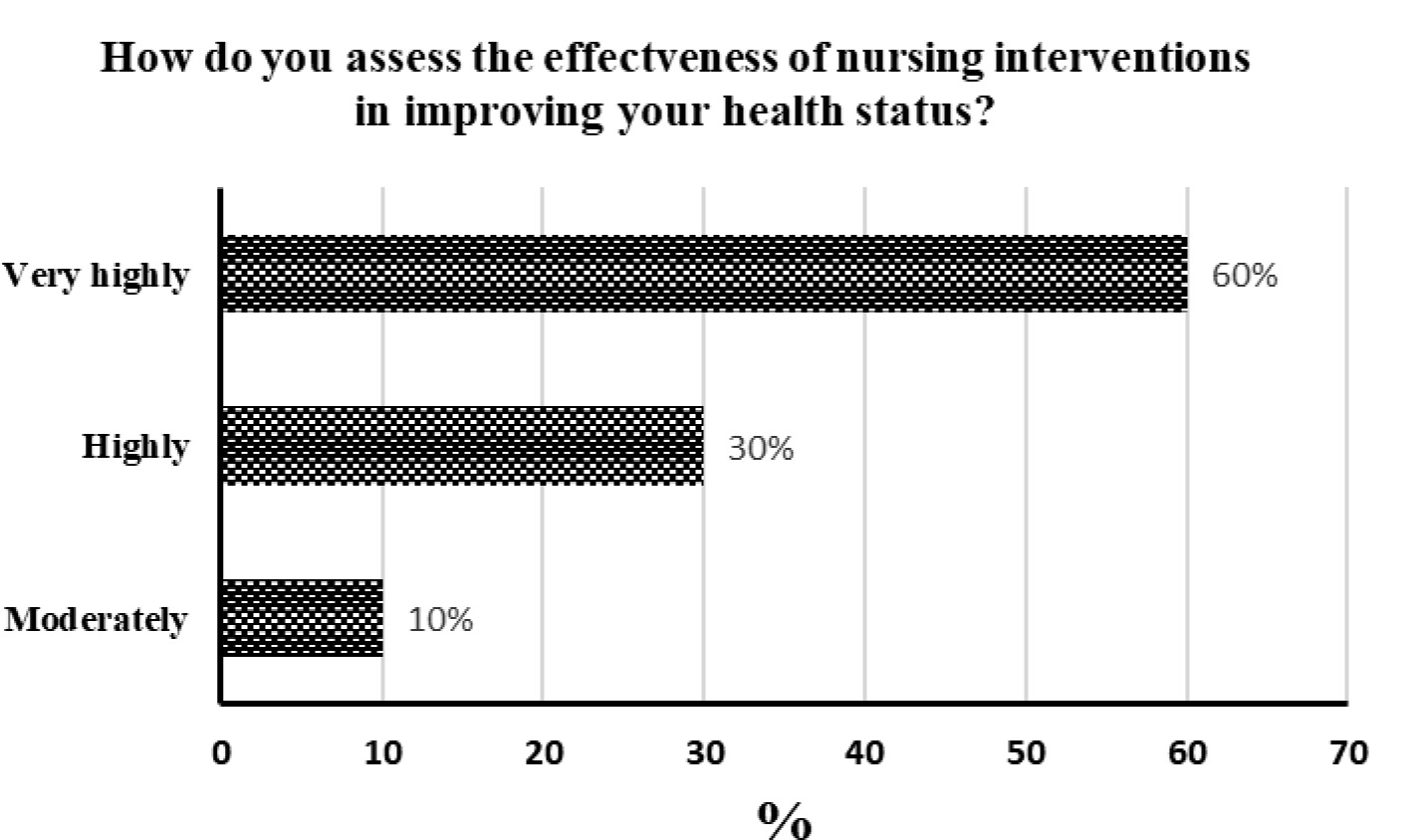 Figure 14 shows the distribution of responses to question no. 13 “How do you assess the effectiveness of nursing interventions in improving your health status?” The majority of respondents (30 participants, 60%) rated the effectiveness of nursing interventions as very high. A further 15 participants (30%) assessed them as highly effective, while 5 respondents (10%) indicated moderate effectiveness.